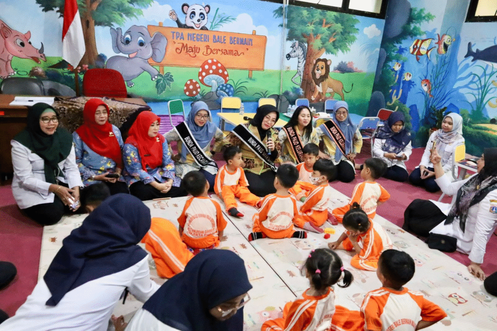 Bunda PAUD Kota Administrasi Jakarta Pusat Witri Yenny Arifin beserta jajaran terkait melakukan kunjungan ke Tempat Penitipan Anak (TPA) Negeri Bale Bermain Maju Bersama di Kantor Wali Kota Jakarta Pusat dan Balai Kota.